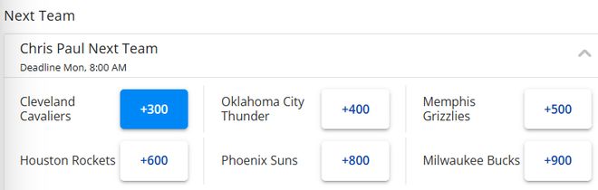 保罗下家最新赔率:骑士成头号热门雷霆第二 火箭第四湖人未上榜